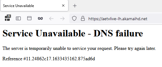 I took a look through the network logs and I think Channels is trying to go to aetvlive-lh.akamaihd.net. When I try that in a browser, I see this: