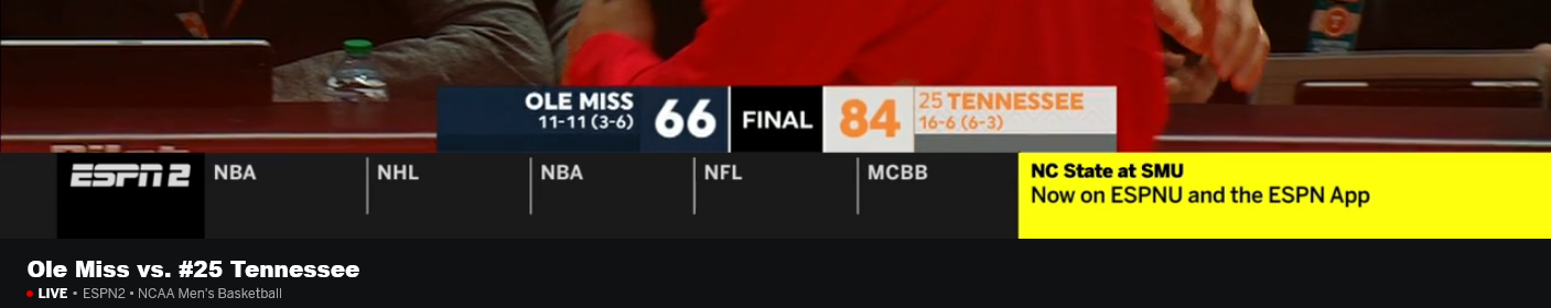 I didn't play anything for the full duration, just spot checked a few channels and relied on their help articles like this one https://support.espn.com/hc/en-us/articles/115003814612-Is-the-content-streaming-on-the-ESPN-app-or-on-ESPN-com-different-from-the-ESPN-networks-on-my-TV