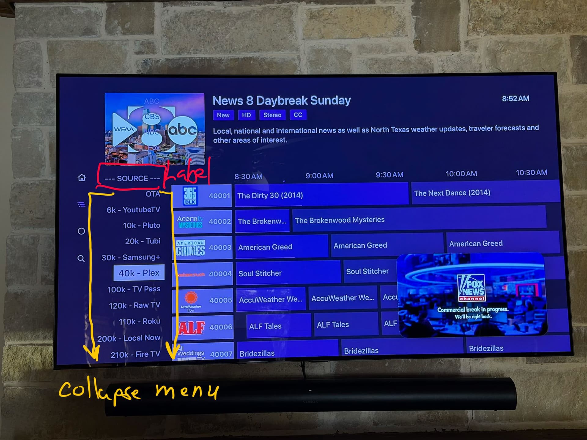 - I use Channel Collection to group my channel source (ie 10k - Pluto) Any 10,000 channel numbers I know to look at Pluto source. I know there is another way to view the source, but this method is fast for me. It would be nice to be able to add a customize label (ie ---- SOURCE ----) without having to create a empty Channel Collection group. It would nice to have the option to collapse the source list. So I will not have to view all the sources all the time.