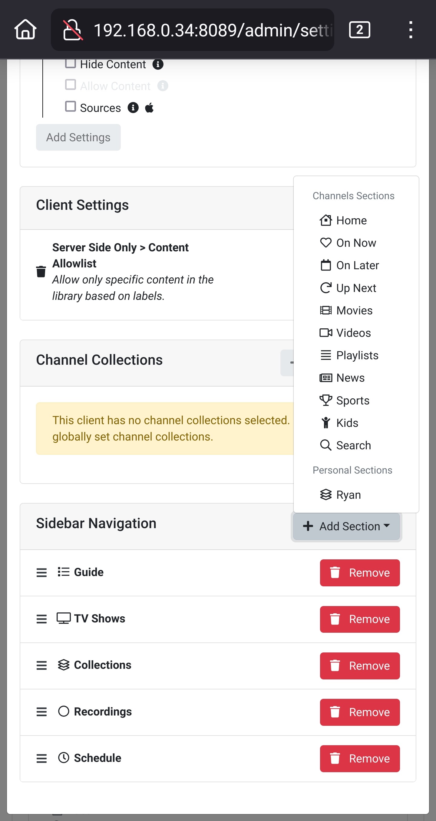 Am I doing something wrong here when I create a personal section of TV shows based on title and then try to add it via server-side as a navigation element?
