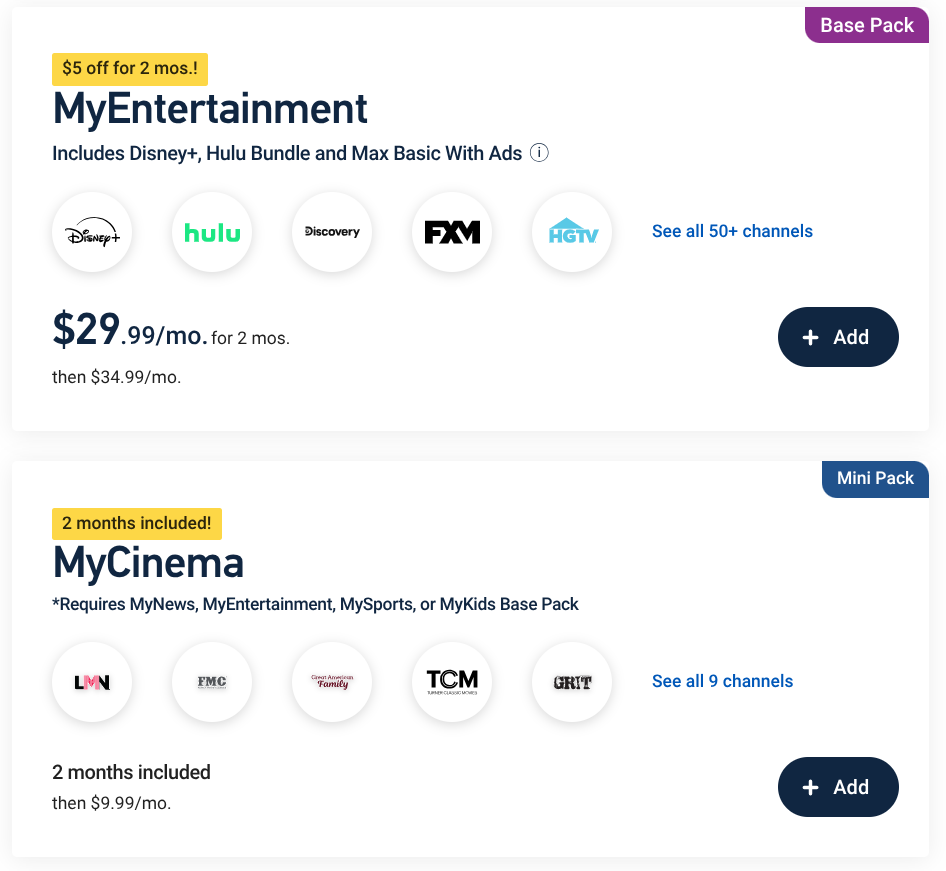 The channels I want/need are all within the "MyEntertainment" package, and the "MyCinema" addon. $45/mo as opposed to $83/mo with YTTV.