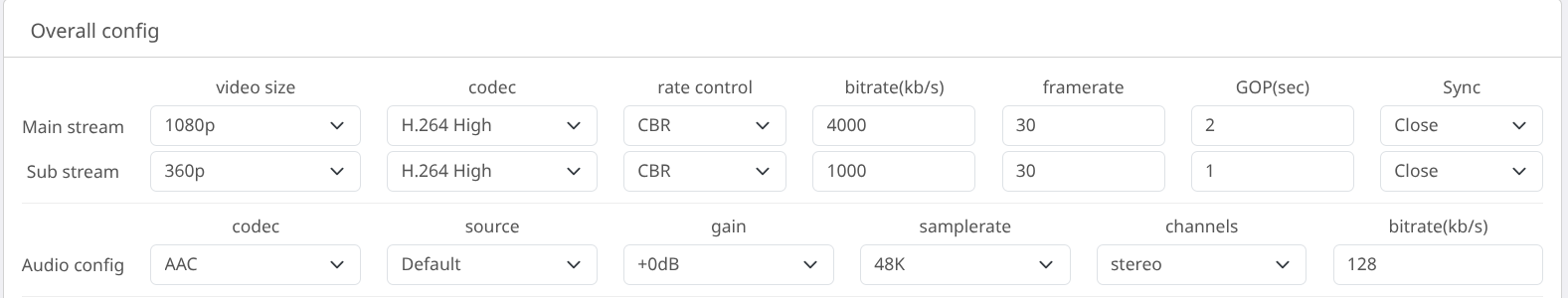 Audio is AAC Stereo Auto Sample Rate (which ends up as 48K) and bitrate of 384 kbps. During my testing I also set a +6dB gain for Onn Plus as they were lower volume than my other boxes. You may not need this.