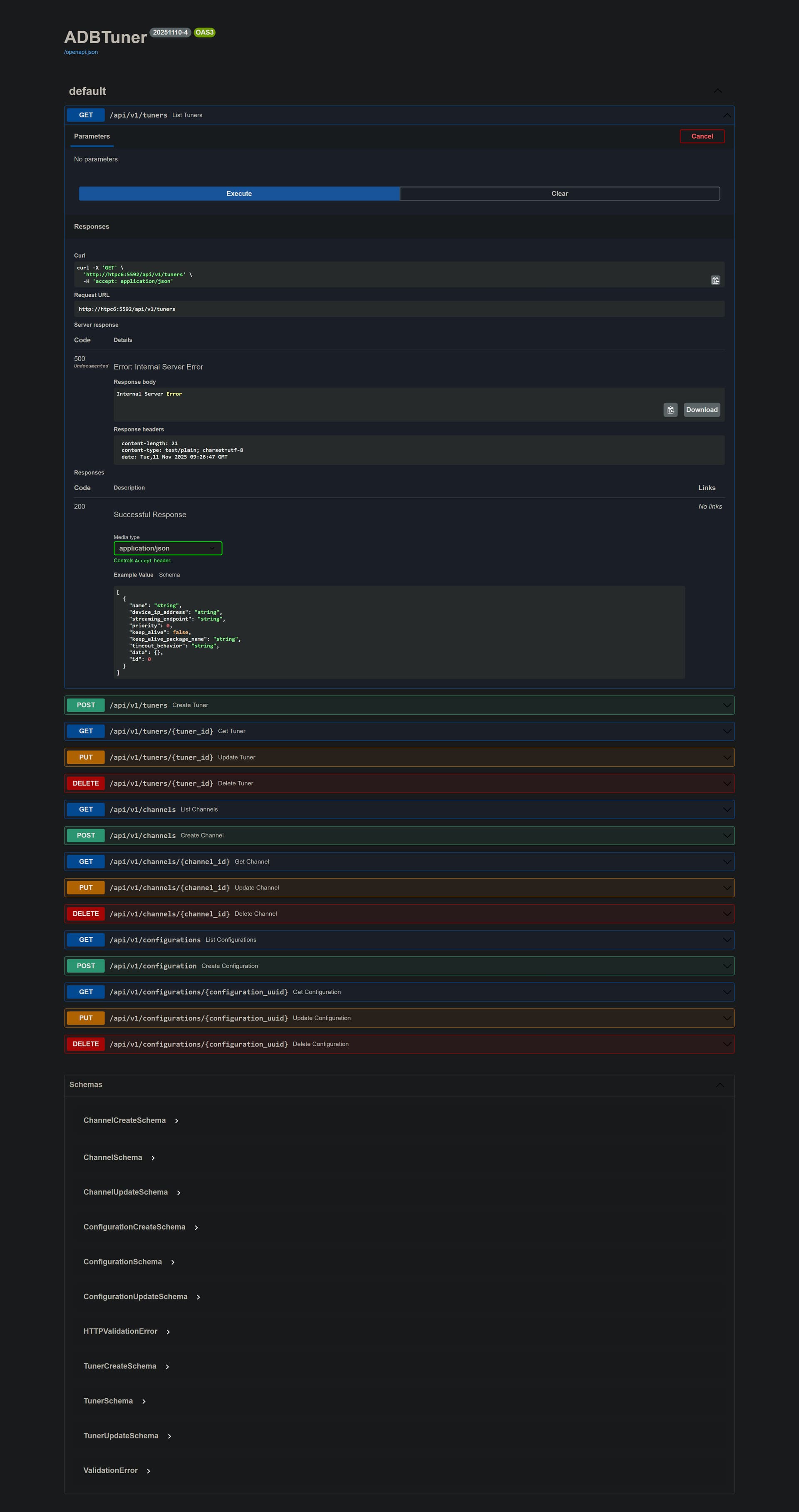 But, listing tuners and channels both failed with 500 errors: