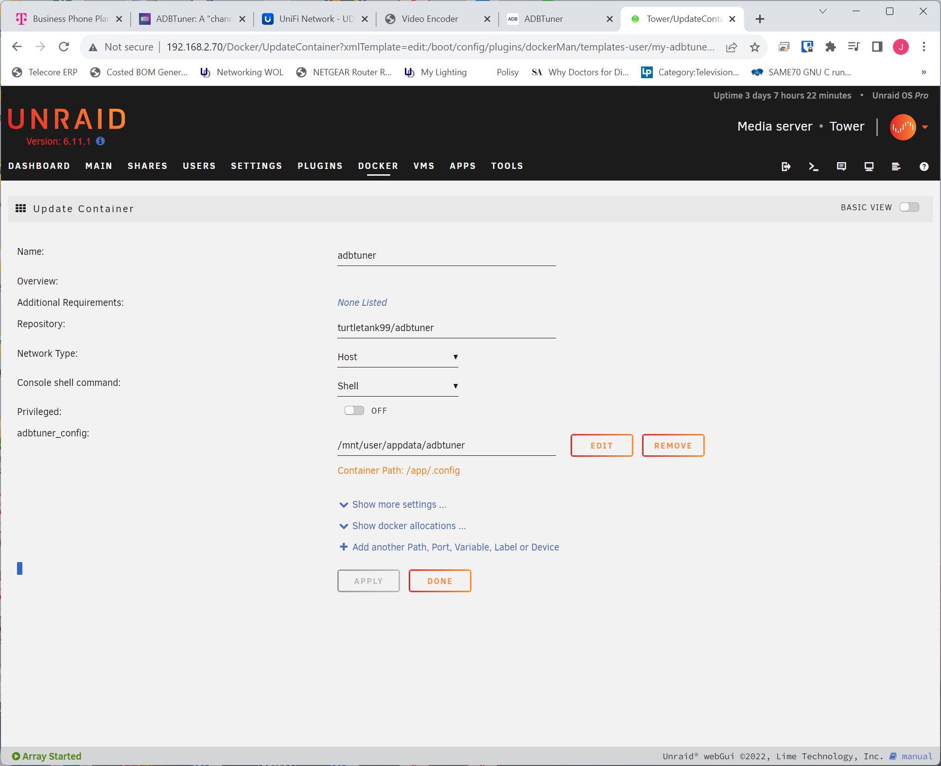 When I installed from CA via Docker Hub it successfully installed the ADBTuner docker, but when I got to the docker website (my_local_unraid_tower_ip:5592) I get an Internal Server Error. Any unique Docker settings required for Unraid?