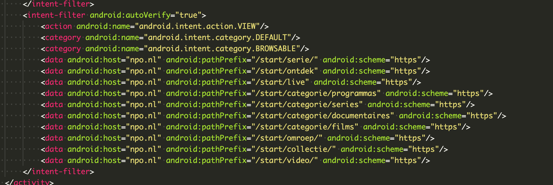 01-25 14:42:05.659 617 684 I ActivityTaskManager: START u0 {act=android.intent.action.VIEW dat=https://npo.nl/... flg=0x10000000 pkg=nl.uitzendinggemist} from uid 2000