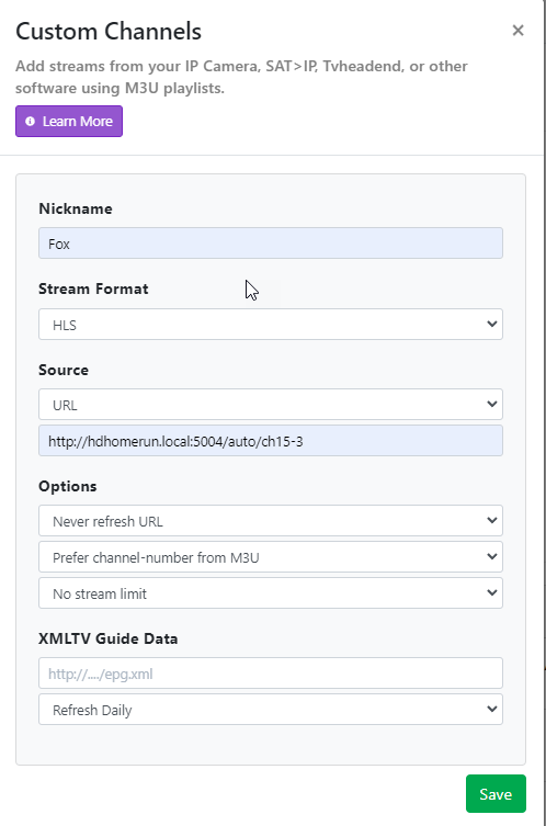 In the mean time, I discovered that if I enter (http://hdhomerun.local:5004/auto/ch15-3) into my VLC player, I get my local FOX station. Is there a way to add this as a custom channel in my Channels DVR setup? I've never tinkered with those settings so wanted to ask before I touched anything.