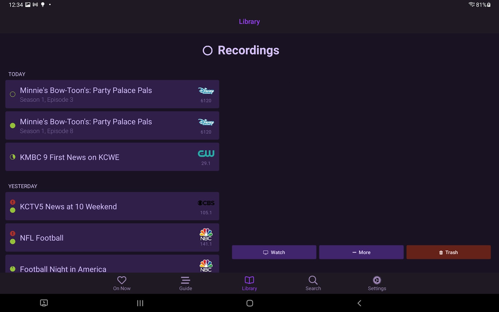 Hi. I'm working with Samsung Galaxy Tab S7+ In the Recordings screen (Library->Recordings), I can't seem to get anything to play. It does not respond when I press on any of the shows I recorded. All I can do is back to the main Library screen. The main library screen works fine. Wondering if anybody has this issue. Thanks.