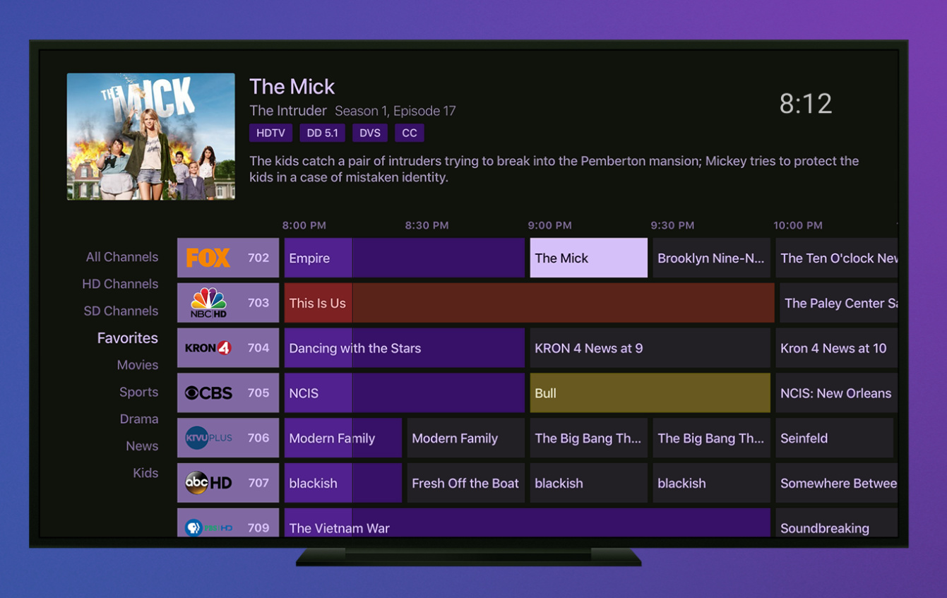 Color options and a clock seemed to be the most requested feature, and I've posted an example of Bell's DVR app in those threads since the app itself looks nearly identical to Channels with a clock and more neutral color palette. Well I took a few mins to modify the Channels UI with similar a similar design, keeping just enough purple for Channels branding and added a small digital clock. Instead of the small indicator dot for the progress the entire guide is now color coded to show just how much time has passed. Vote it up if you like it, this can be the new thread for everyone requesting either change!