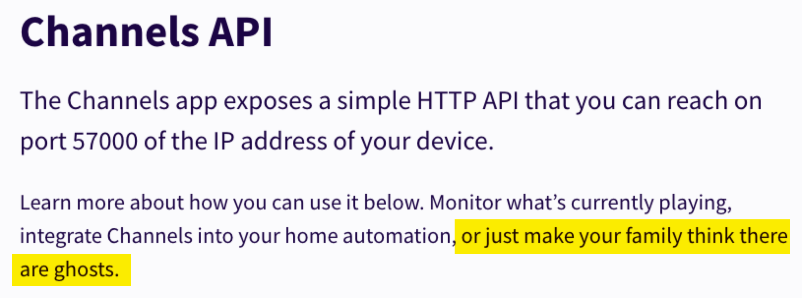 I get that this request may take some time, and I really do appreciate all of the hard work that you guys put into Channels. But I do want to point out one thing: You literally mentioned ghosts on the API page, so we clearly need this to work for my Halloween projector automation!