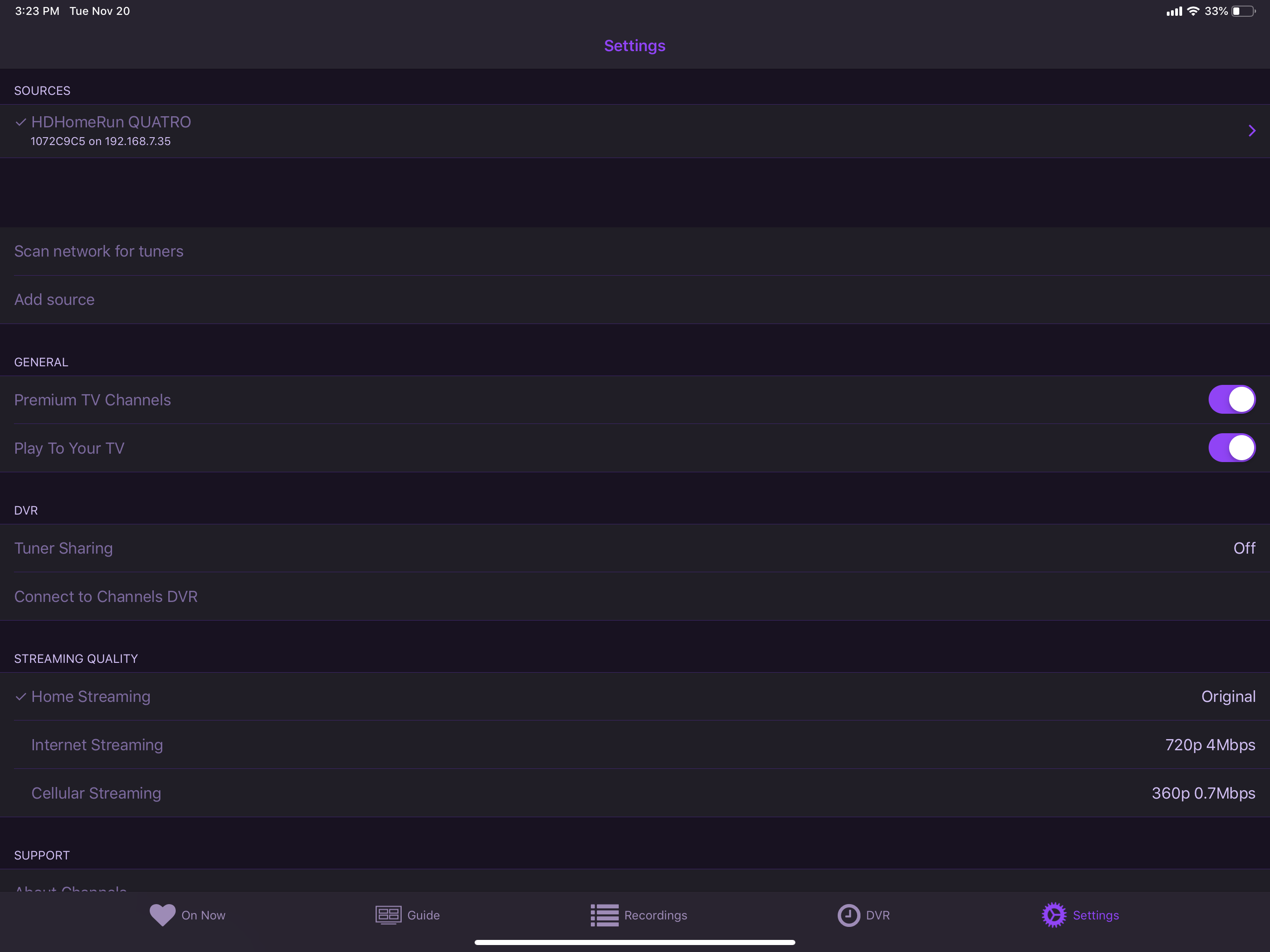 Channels app on AppleTV can see the recordings but no live tv or guide. It will also not accept the IP address found on myhdhomerun.com.