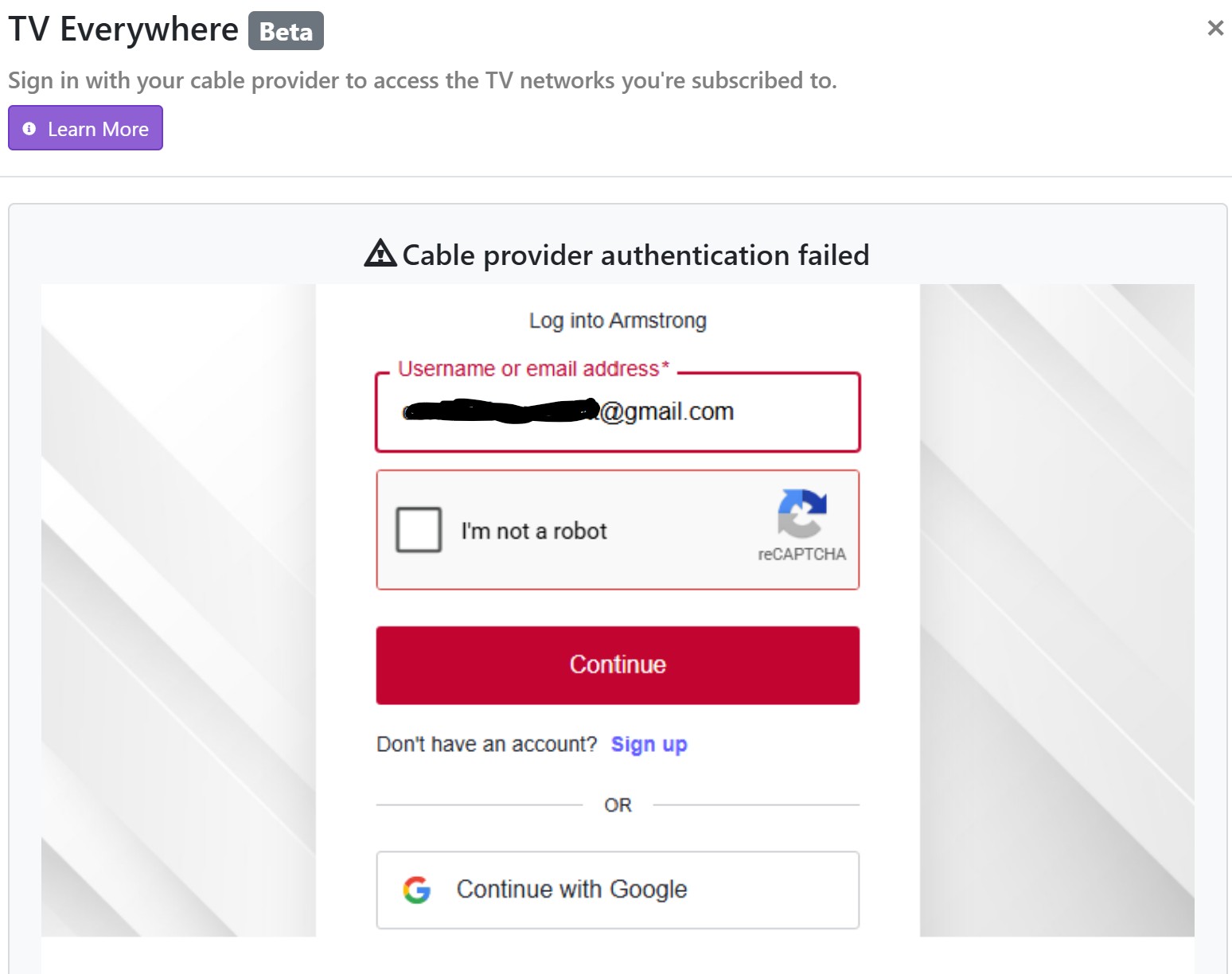 Wasn't able to tune to any of my TVE through Armstrong and got this error all of sudden after removing it as a source and trying to re-add it