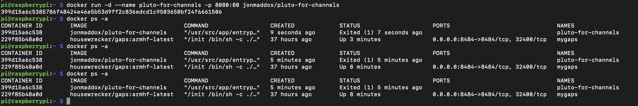 OK, the Pluto for Channels docker image is now built successfully for ARM and for Raspberry Pi use. You should be able to fire it up now.