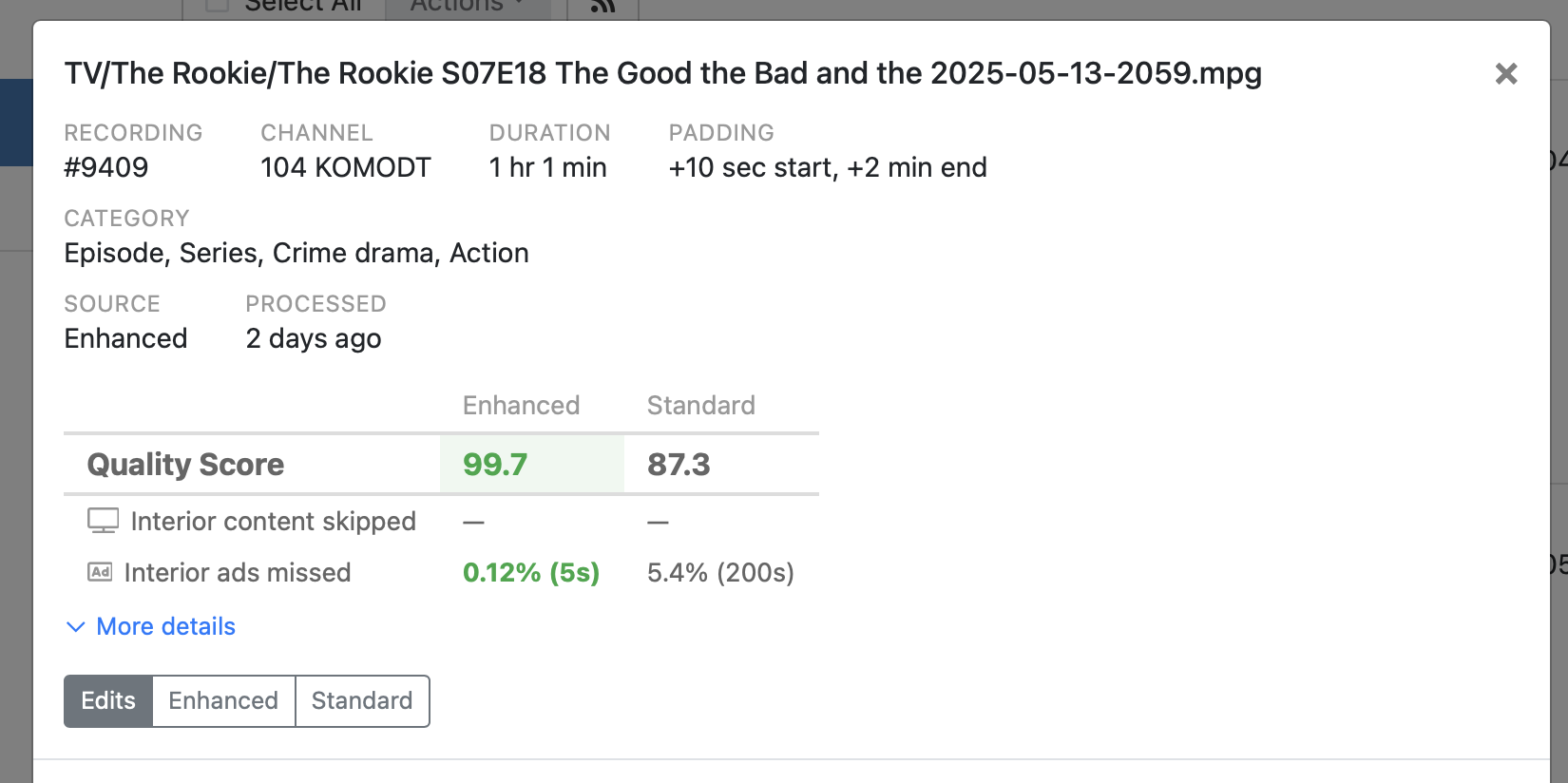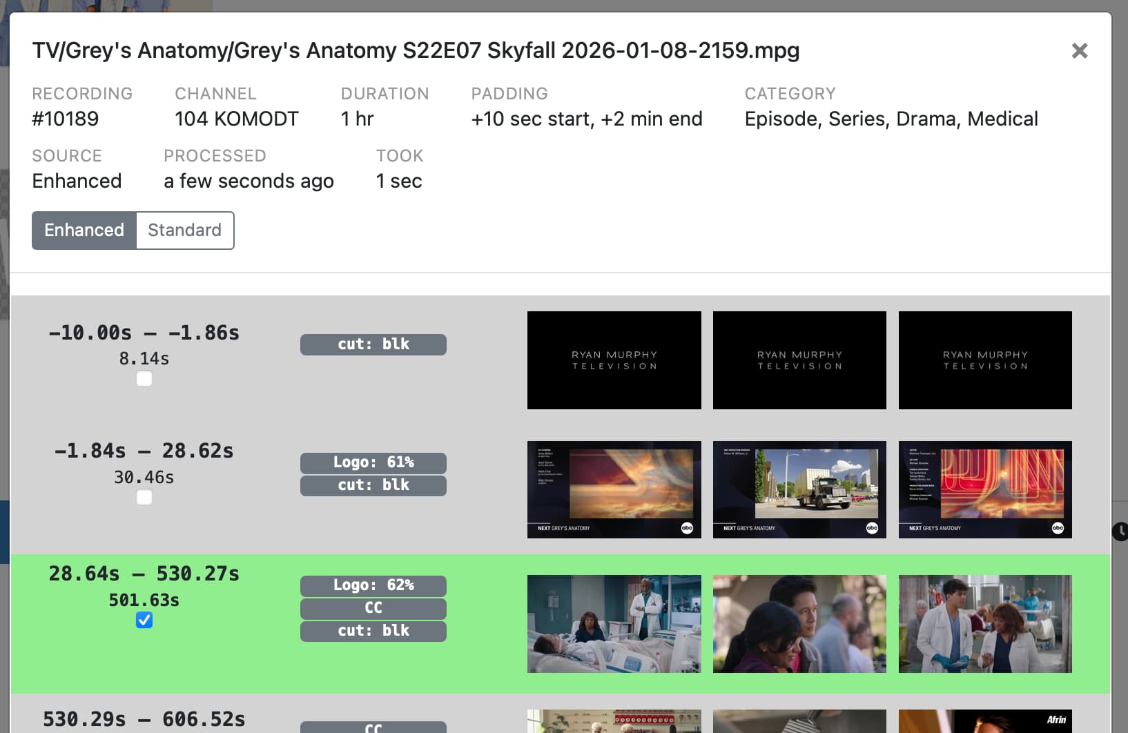 Our Enhanced system is built on top of our existing comskip solution which means that the normal comskip process will run and complete before the enhanced process does. Once standard comskip has completed it will take between 1-10s for the enhanced process to complete on a recording.