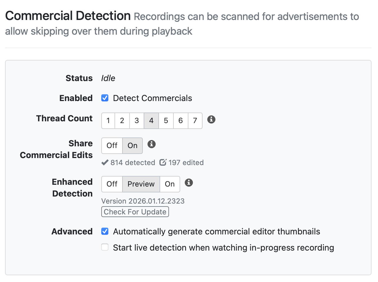 - On: Enhanced Detection will be run on all shows and any show that has not been edited and the commercials will be updated