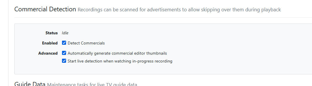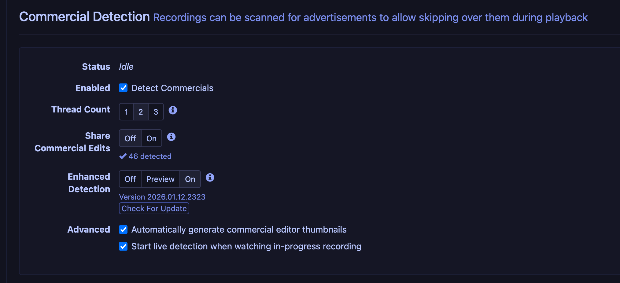 Did this feature not make it into the latest stable release? I have a Synology NAS DS1019+ on 2026.02.09.1530 and had assumed I'd be able to enable the Enhanced Commercial Detection. Under Commercial Detection I see the button to enable Share Commercial Edits but I'm not seeing the box for Enhanced Detection that shows the options for Off/Preview/On.