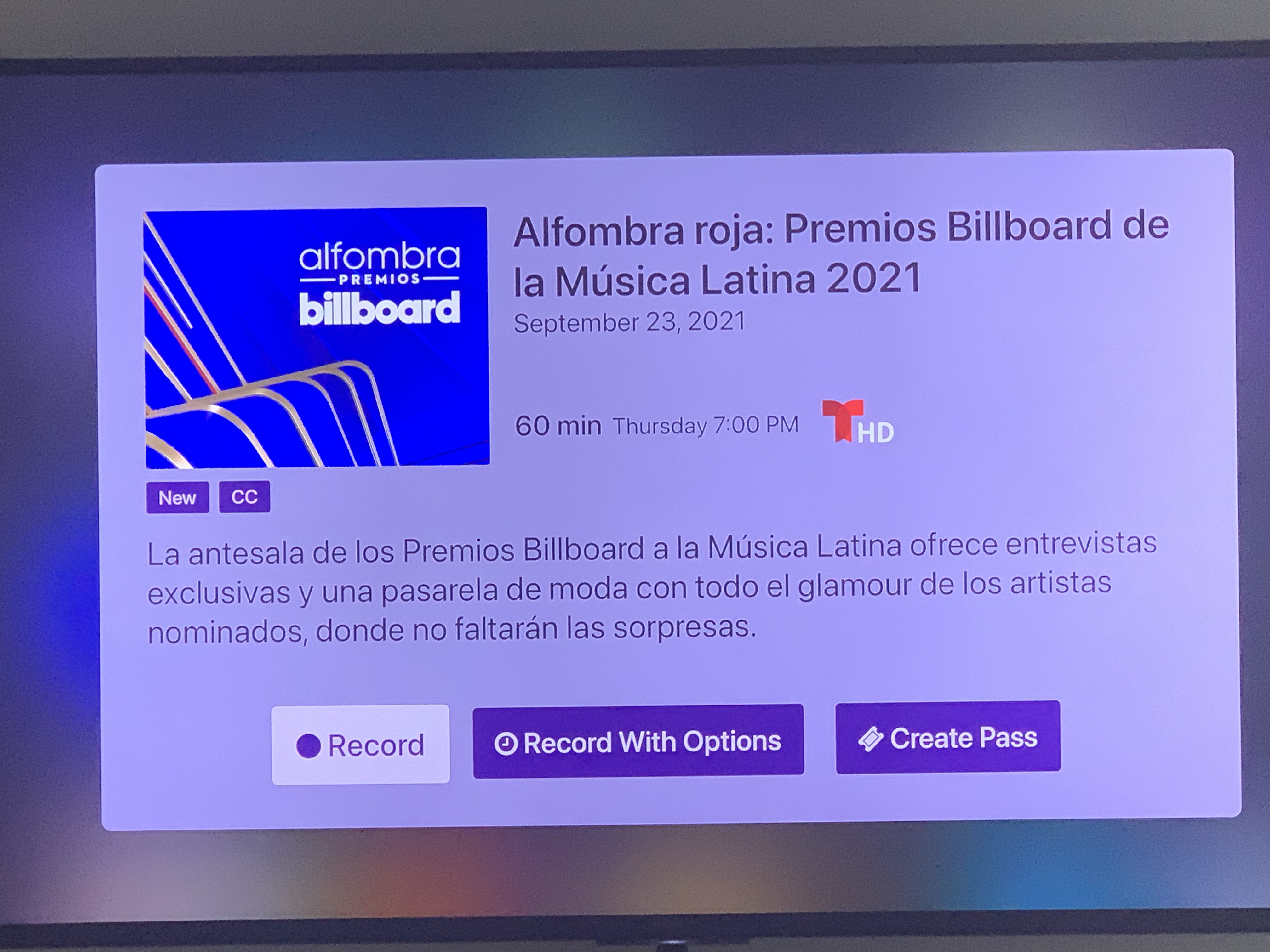 I hid Telemundo a week or so ago. But under On Later: Specials, I see three different entries related to the Latin Music Billboard Awards airing on 9/23 on that channel.