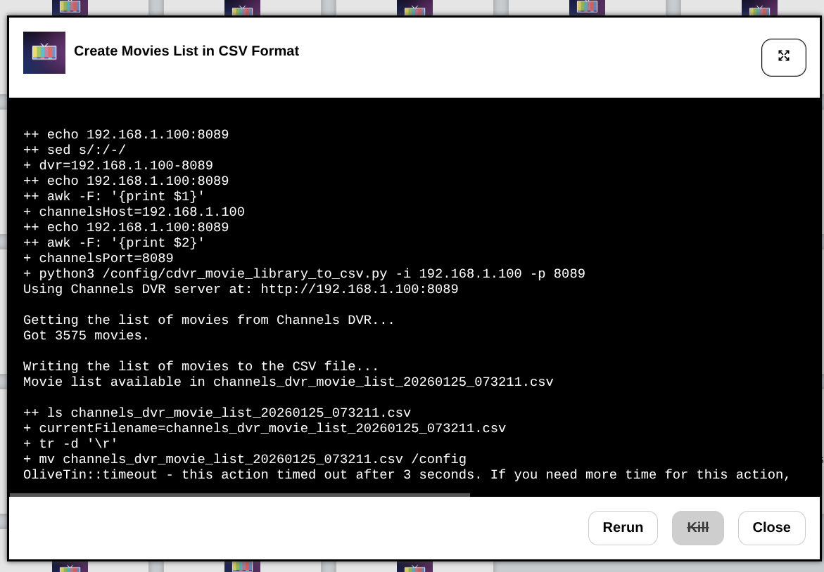As a comparison, I just ran the action directly from Olivetin (still on v.2026.01.23:test) I will say that it took a bit longer than I expected for the action to run. About 19 seconds. That may simply be caused by the $h%tload of movies I have. Timeout error is still there as I haven't updated the Olivetin stack or Tampermonkey scripts.