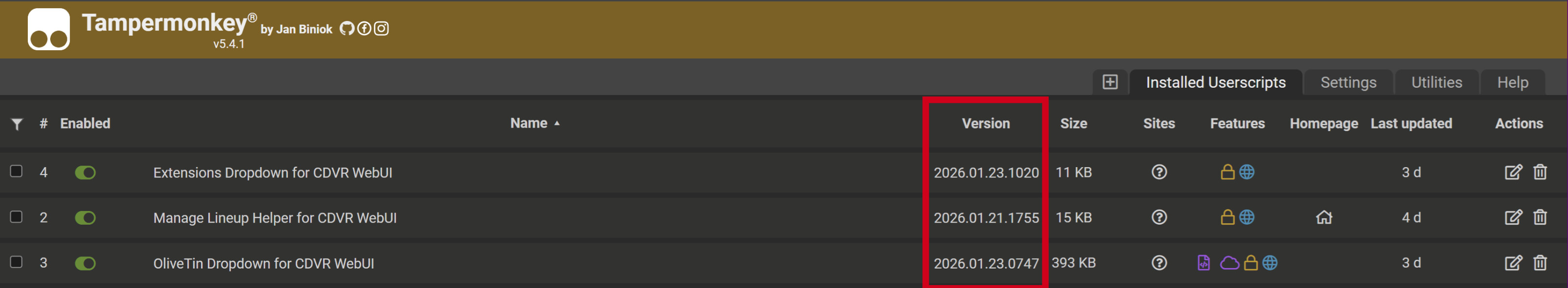 Click on them one-by-one, which should open a Tampermonkey window to install each. After that, navigate to the CDVR WebUI and refresh your browser. The new dropdowns should be there.