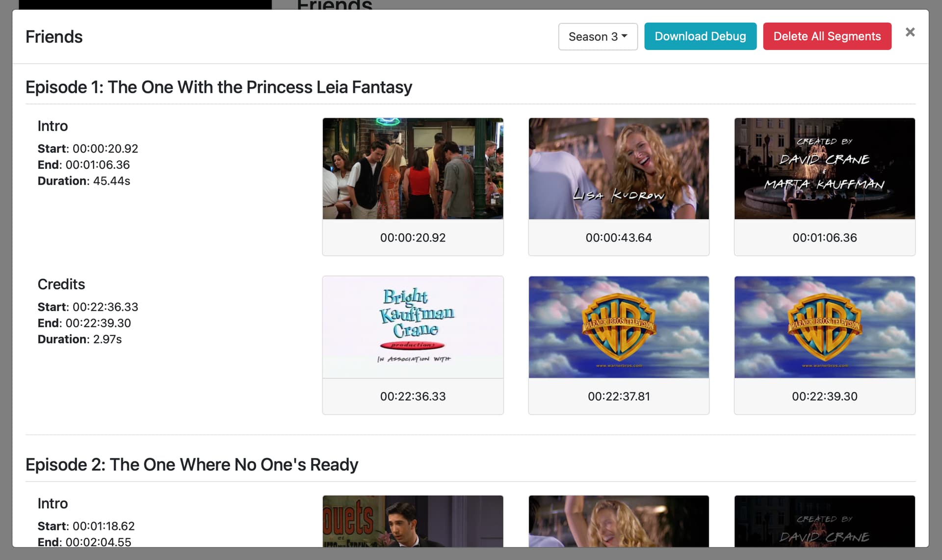 This will open a modal listing all of the detected segments of each episode grouped by season. You can adjust the season with the drop down at the top.