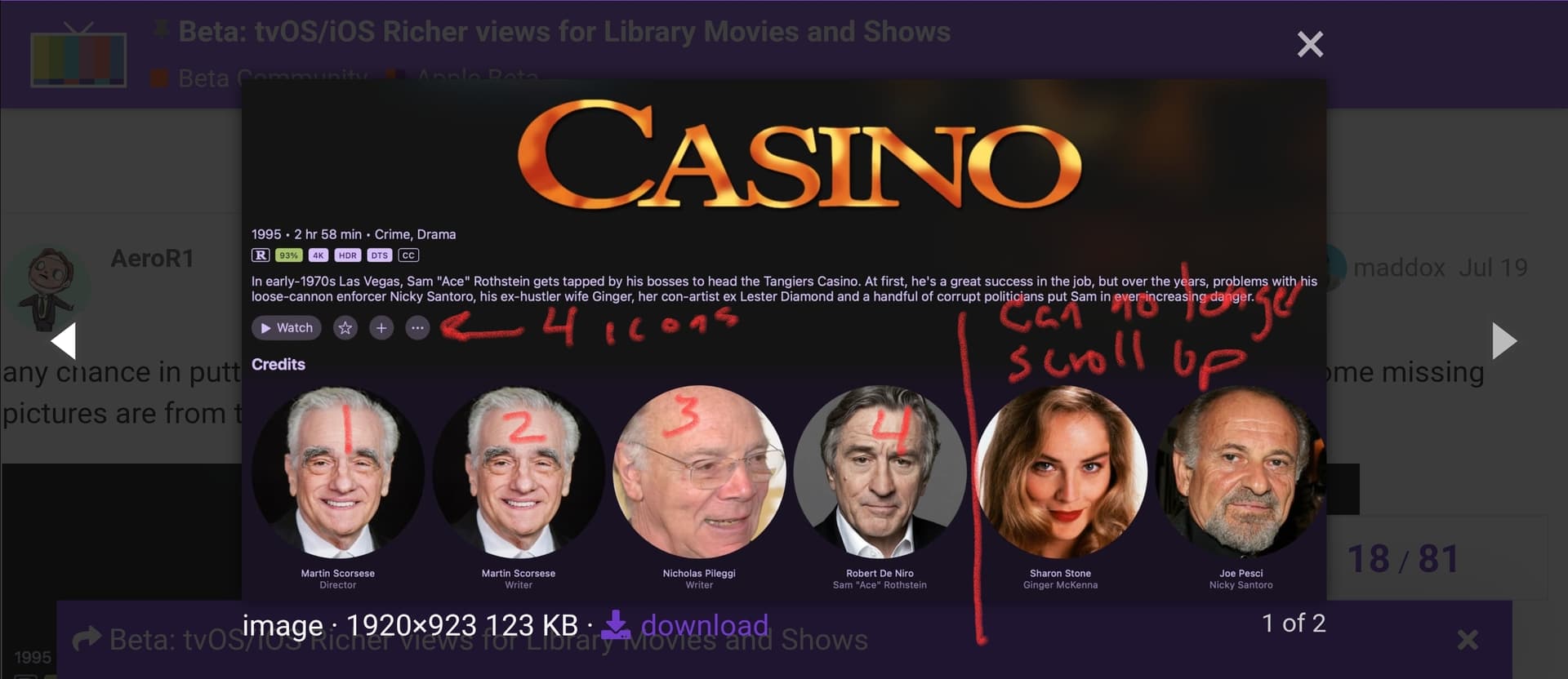 I am seeing something that i would like to request be modified. When you open a movie and then scroll down to see more information (to the credits section in my case). If you then go right to look at more people, at a certain point, you cant scroll up anymore without first going back to the left.