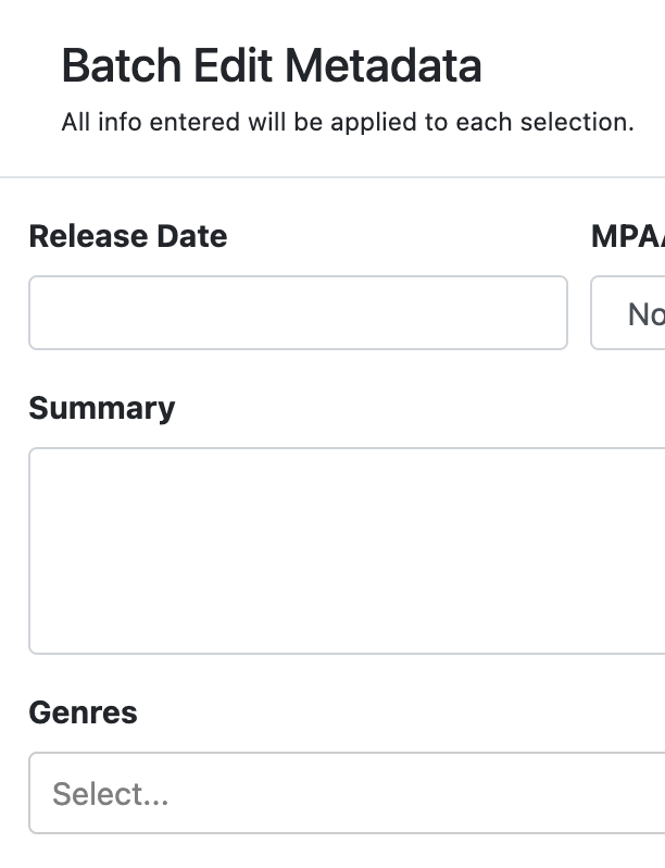 My apologies if this has already been answered. I have about 80 movies to import and I'd like to bulk change metadata such as Genre. I see the editor allows making certain bulk changes, but nothing for bulk genre. Is this possible ?.. Perhaps via CURL ??.
