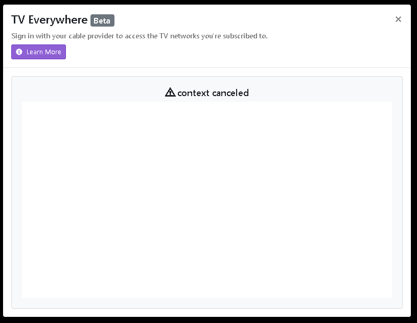 My TV Everywhere was previously working, but had stopped working so I deleted the source and tried to re-add. Am using correct credentials but getting this error screen: