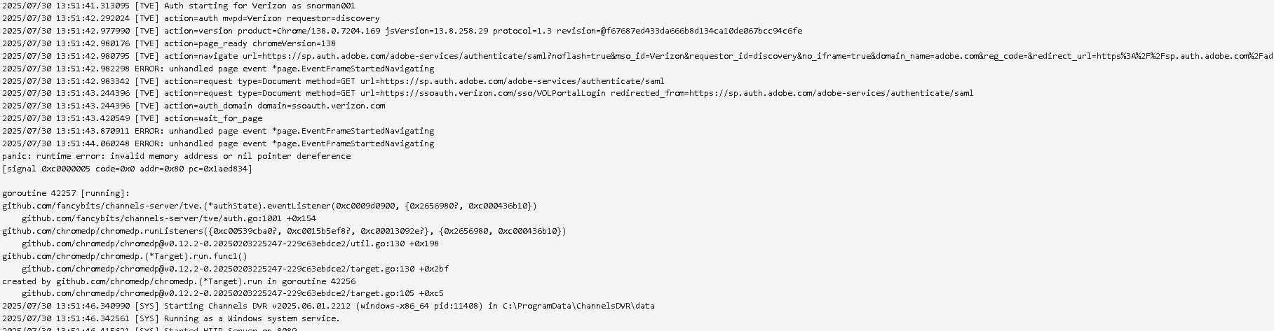 Yes, I sent logs. Weirdly, its now doing what you see in the log below and actually crashes the Channels server!