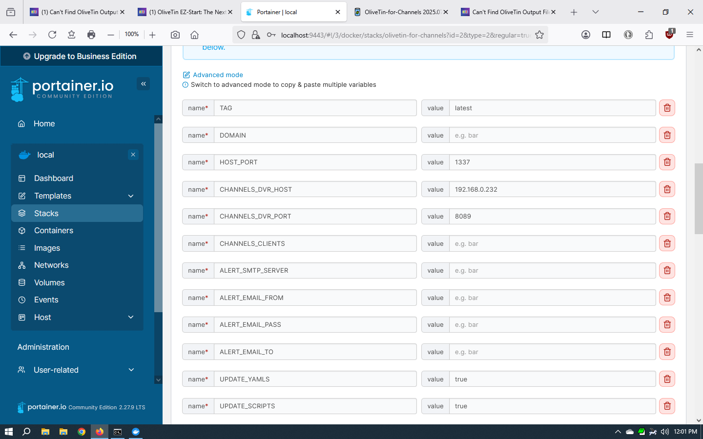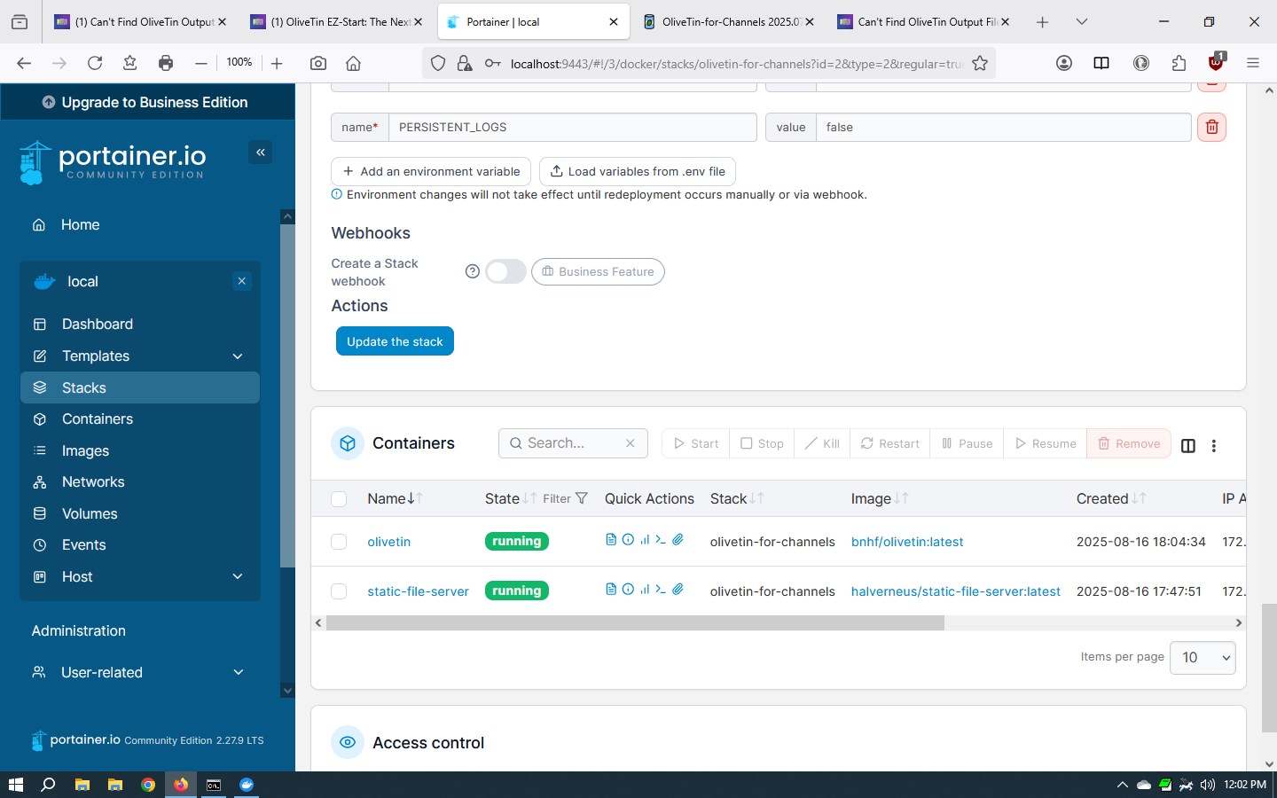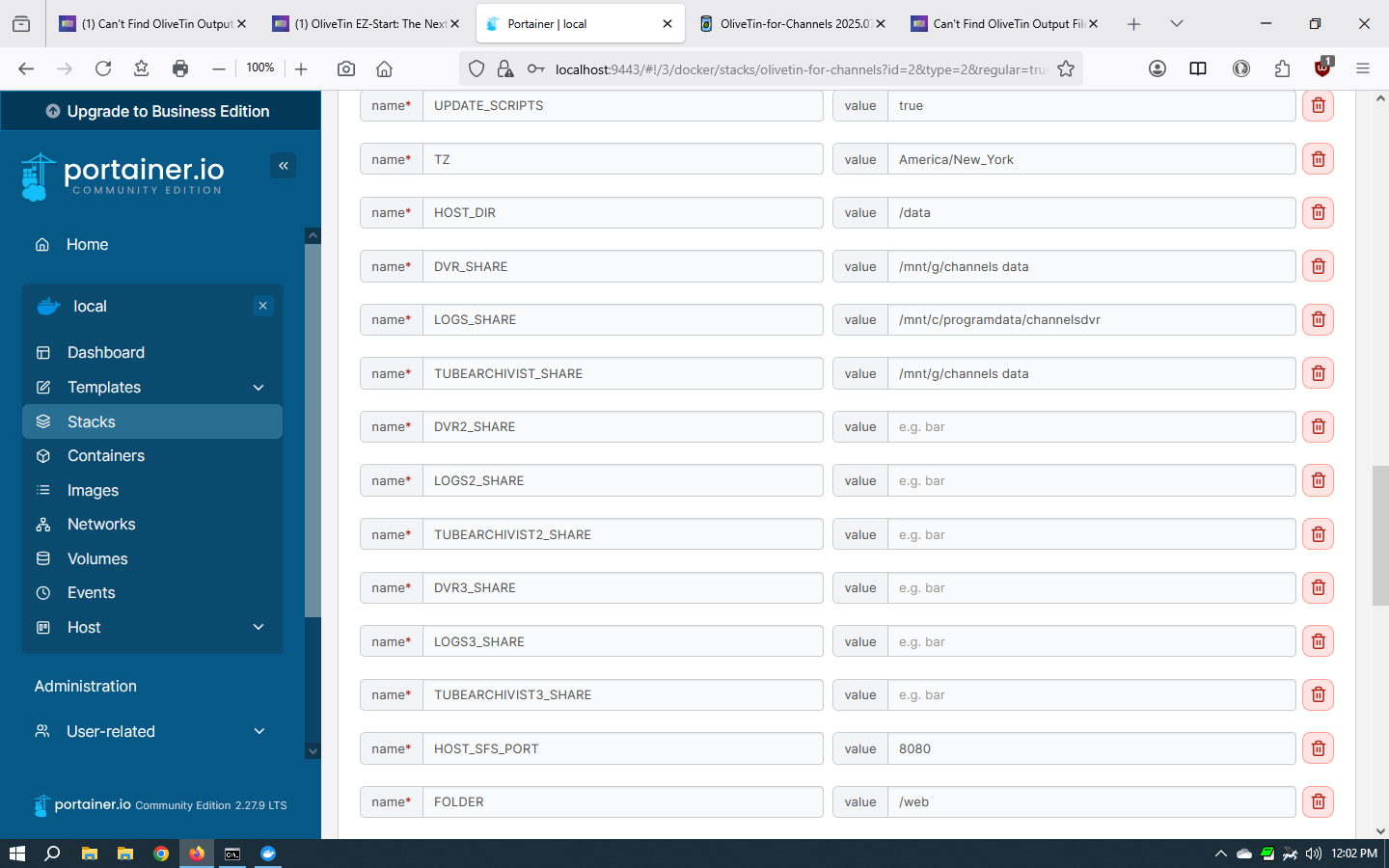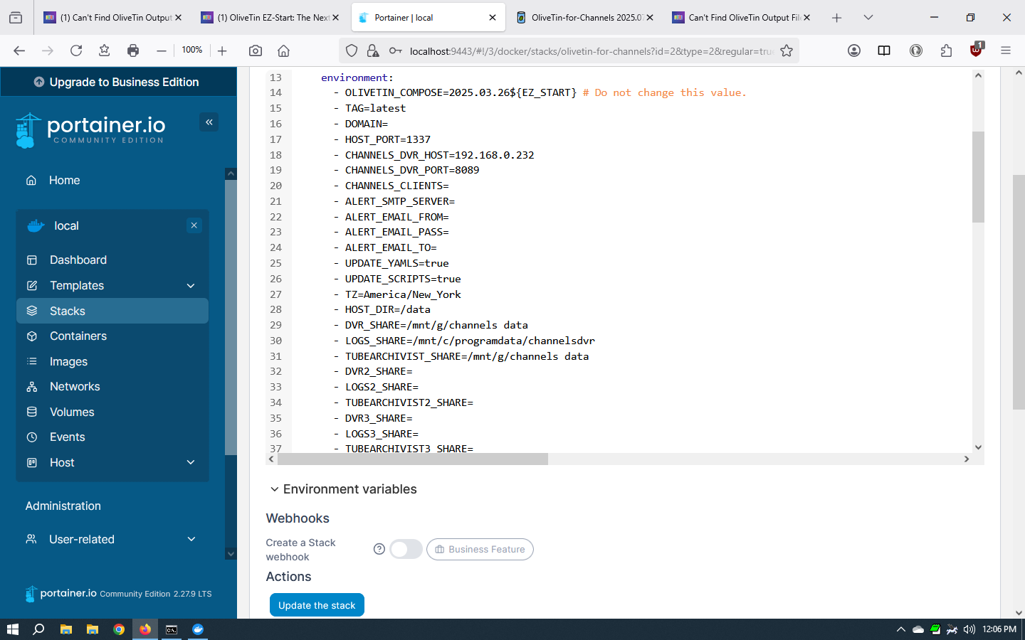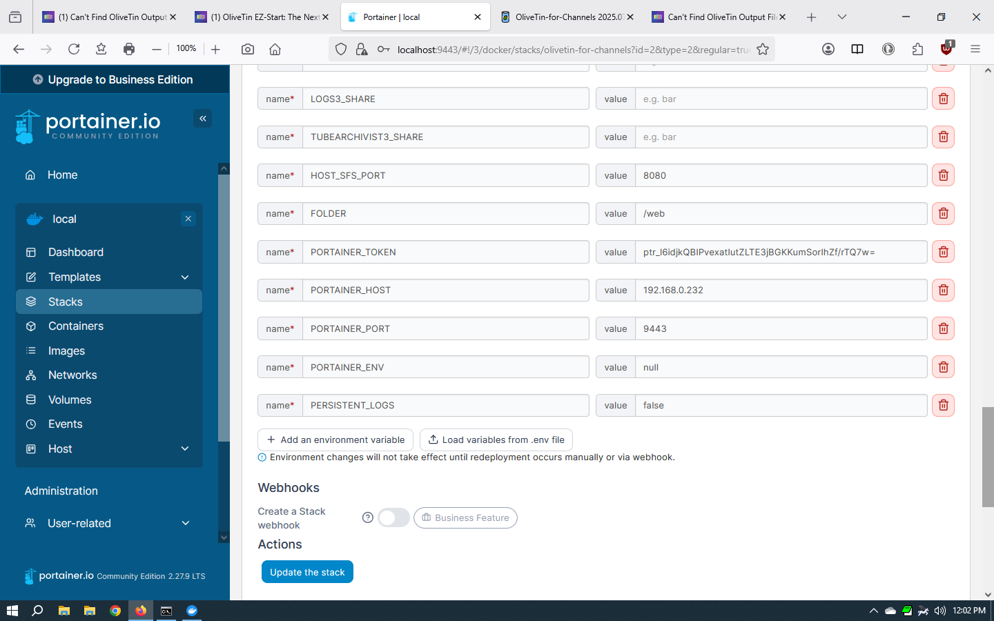 So, let's try using Windows paths for OliveTin instead of Linux paths. You'll need to stop the OliveTin stack, and then in the Environment variables section of the Stack Editor change the following values to those shown here:
