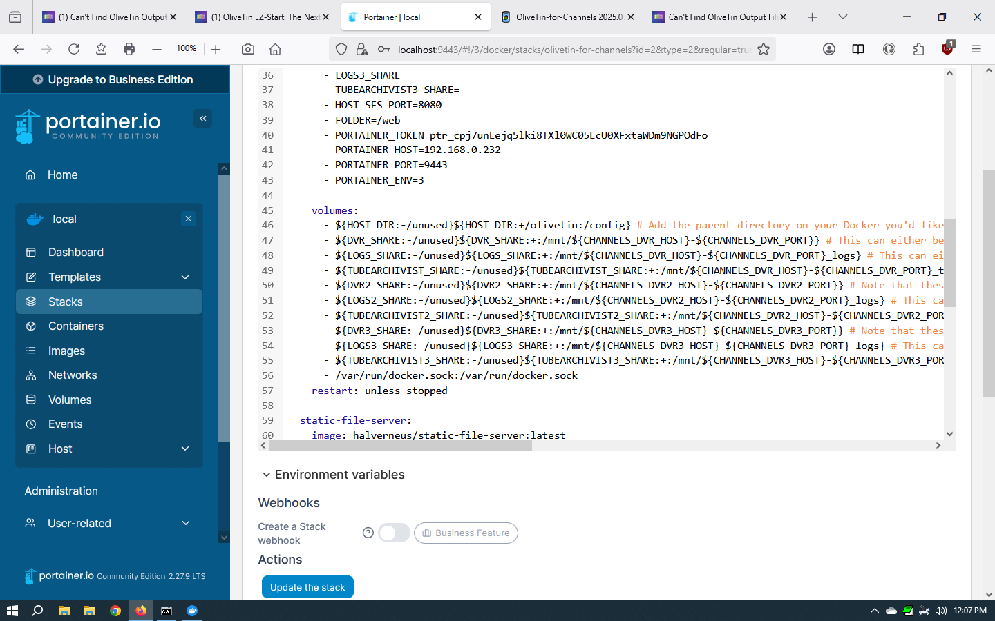 Can you post a screenshot from the OliveTin stack in the Portainer-Stack-Editor, showing the environment variables? It should look something like this: