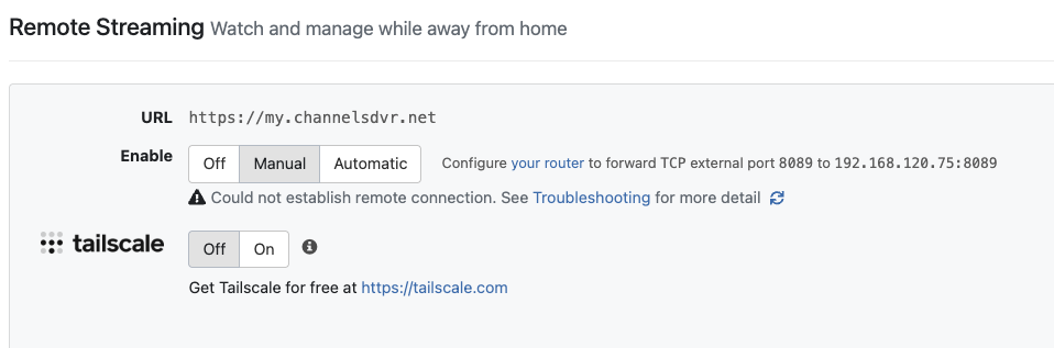 I just did a new install after subscribing to Channels DVR. I am using a FrieWalla Gold firewall, and the install automatically created the port forward correctly as far as I could tell but it would not connect.
