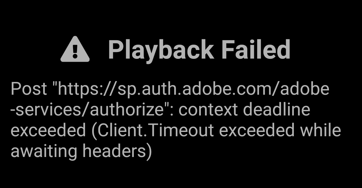 20:59:11.694008 [ERR] Failed to start stream on channel 6086 via TVE-Spectrum: TVE: Post "https://sp.auth.adobe.com/adobe-services/authorize": context deadline exceeded (Client.Timeout exceeded while awaiting headers)