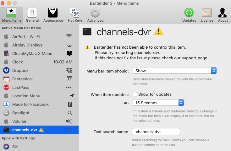 I use an app to hide certain menu bar icons call Bartender. I seem to get an error with the Channels DVR app. See attached. Is this something simple the developers can fix?