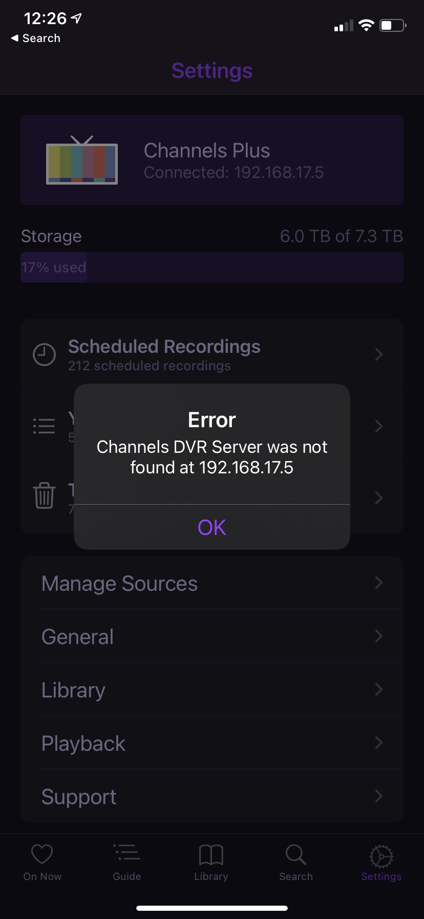 I'm running Channels DVR (2020.12.31.0029) on Ubuntu and noticed on my IOS clients (IOS 14.2, Iphone 11, 4.3.3) I only see 2 sources (both HDHR). I currently have 10 sources on the server. I'm not sure when this happened but I noticed it a couple of days ago. All Libraries, etc are accessible.