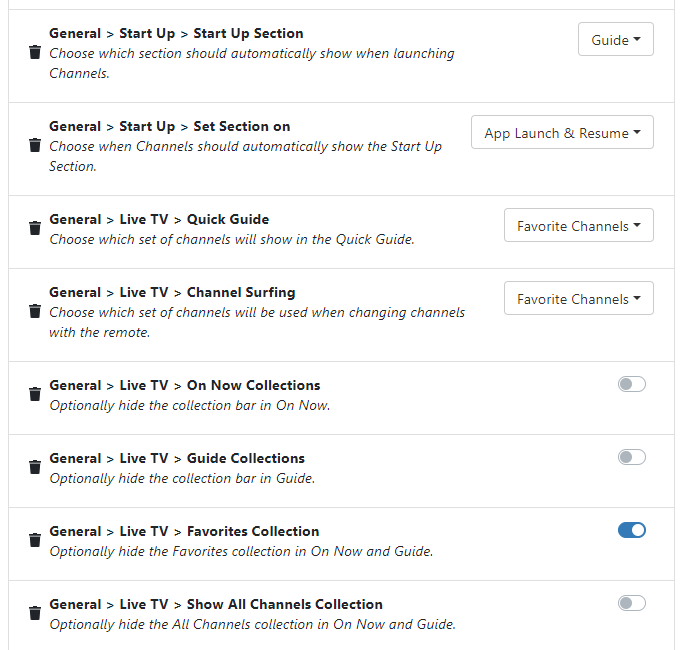 100% on board with that, I use the server side settings to make all clients (only 2) look and act the same, and be as simple and non-redundant as possible. only have the guide, recordings, tv shows, and movies showing on the left side. I prefer the guide drop-down box hidden but lately I've been playing with the channel collections, using the dropdown to choose from them. I have Antenna, Xfinity, PBS, Stirr, Pluto, and Samsung+ but for some reason channels from one collection will show in another one. The stirr channels don't show at all to be added to a collection. Having several large collections doesn't seem to work as planned. Swear I thought there was a way to have the sources in that dropdown, and not need the collections. Anyways, that's a different issue I need to look into.