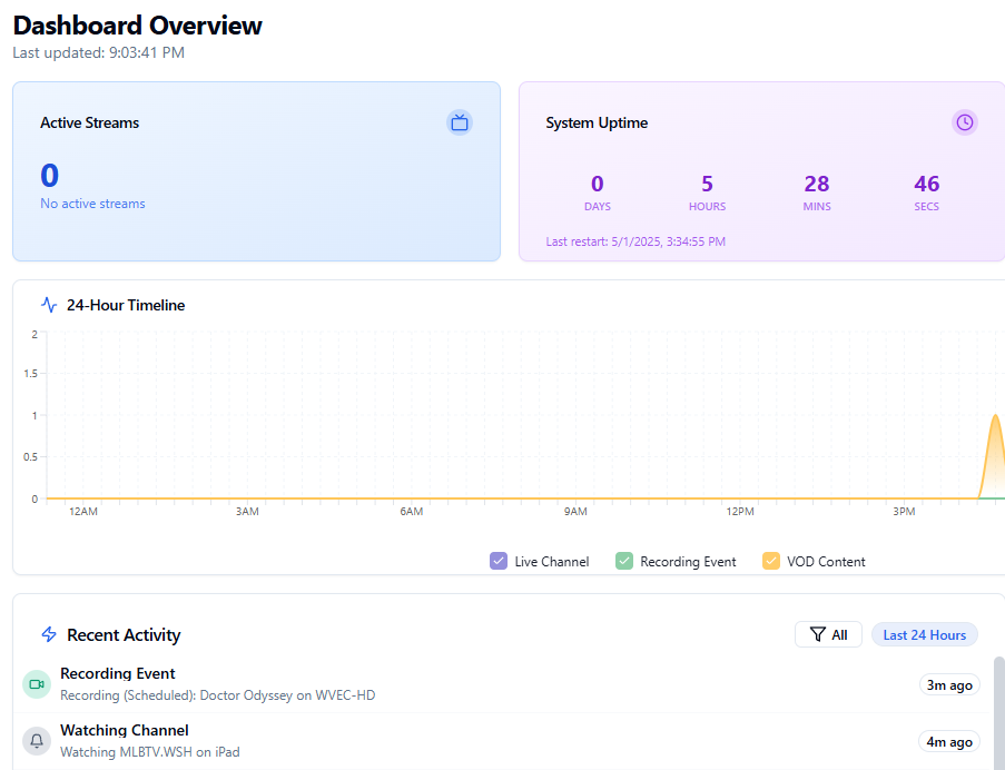 @CoderLuii Very cool, it's like Tautulli for Plex but on steroids. I've tried to install it and it finds my recording schedule but for some reason it does not catch when I am watching channels. It never shows that I am streaming.