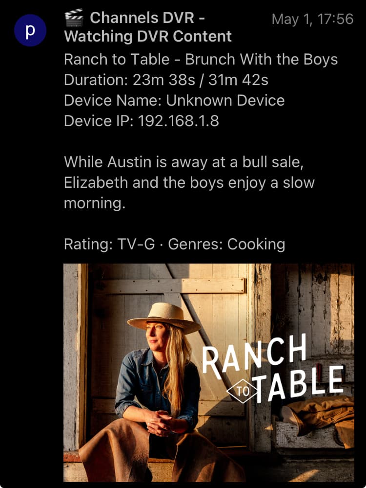 [2025-05-01 20:59:33] [CORE] Sending notification: Channels DVR - Watching TV