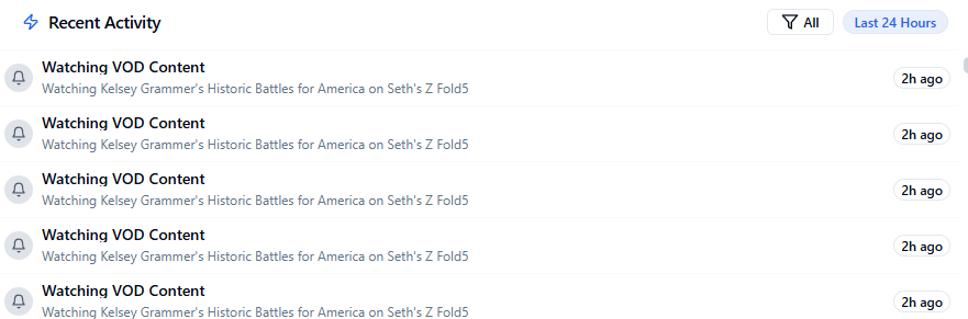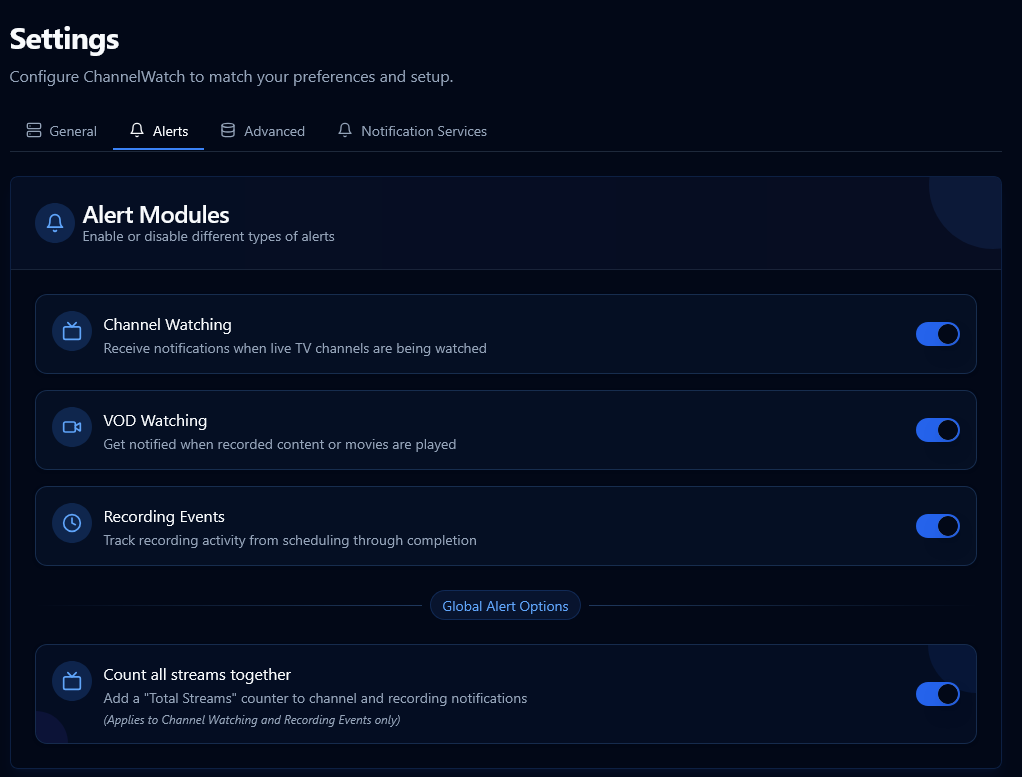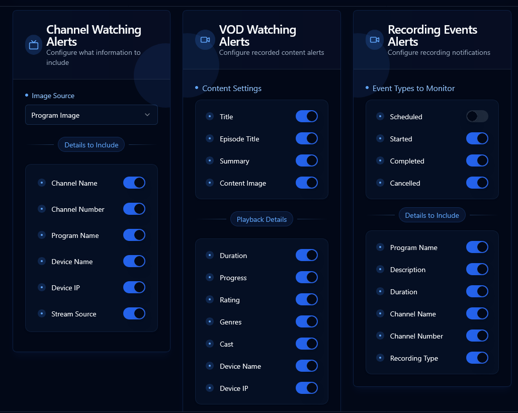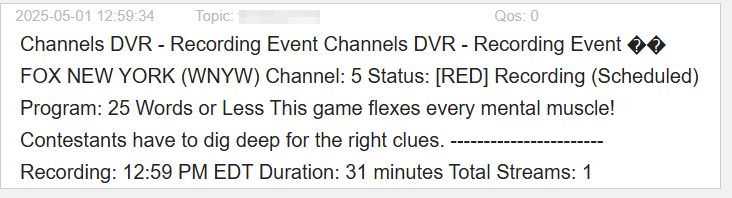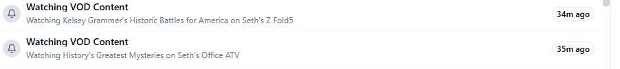 Thats just the alert config issue. The other issue is that Channelwatch isnt showing me anything but scheduled recordings. It looks like it is pulling info from channels, it displays this below when watching a live tv channel. My recent activity is not showing anything.