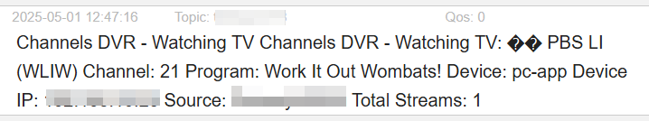 [2025-04-30 17:32:48] [CORE] Event: {"Type":"activities.set","Name":"7-ch15.1-dANY-ip192.168.254.237","Value":"Watching ch15.1 from 192.168.254.237 (Transcoder Running at 10mbps: 6m34s @ 1.00x (29.89fps)): strength=100% quality=100% symbol=100% rate=9.4Mb/sec buf=0% drop=0%"}