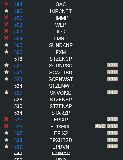 In my screen capture above, all the Starz channels are DRM, but the ones with lines through them aren't in my lineup and can't be tuned. Like 524.