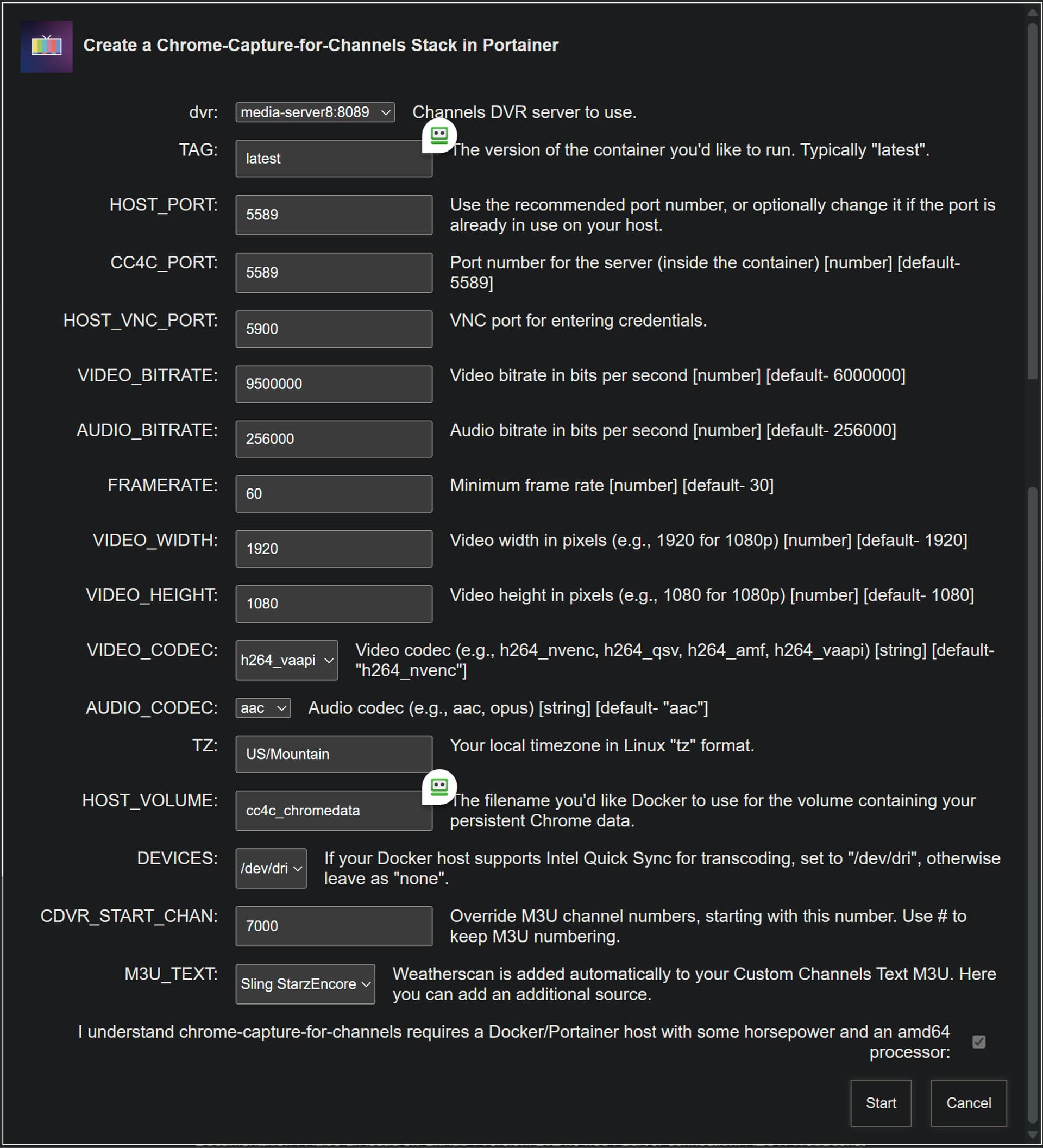 - VIDEO_CODEC=${VIDEO_CODEC:-h264_nvenc} # Video codec (e.g., h264_nvenc, h264_qsv, h264_amf, h264_vaapi) [string] [default: "h264_nvenc"]