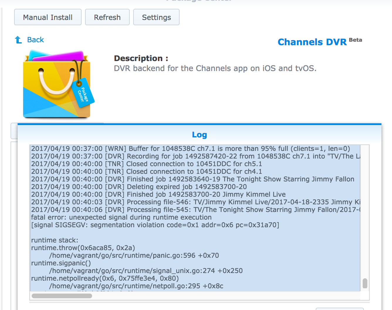 I looked at my log today and noticed this crash. It looks like it is still running, but the error message doesn’t look good. I’m using version 2017.04.21.2259 and recently switched from my PC to using my Synology NAS. Everything has been working fine since I switched a couple days ago until now.