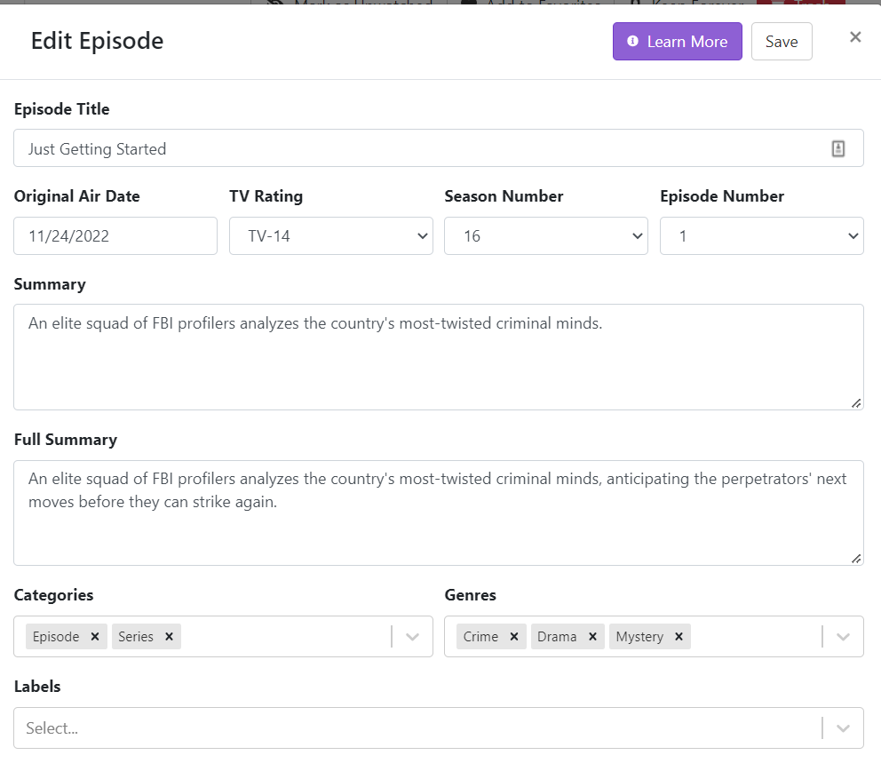 I also tried to match to Criminal Minds S16 and I get the generic description.