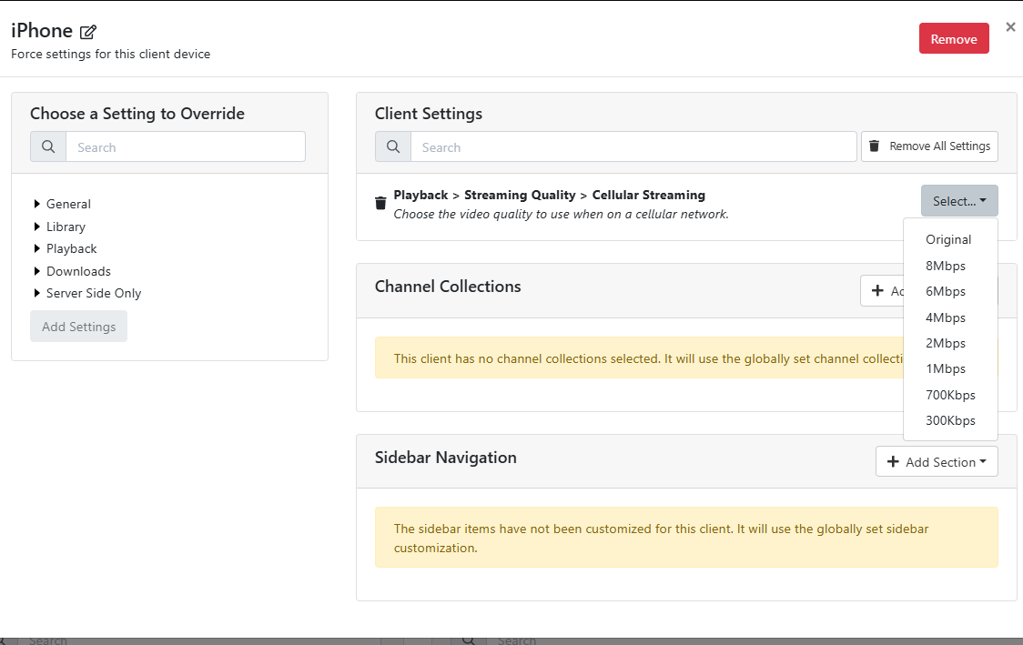 I'm wondering how to get different clients to use different HDHomeRun EXTEND transcode profiles (ex. local client heavy/none, remote client mobile). I figured I'd leave transcoder set to None under Sources in the Channels DVR web admin and then set the transcoder on each client, but when doing this, the remote client which was set to mobile was streaming at 10-11 Mbps, which is too high for that profile. When setting the web admin transcoder to mobile as well, the remote client stream dropped to the expected 3-4 Mbps. This is with playback quality set to Original / Stream.