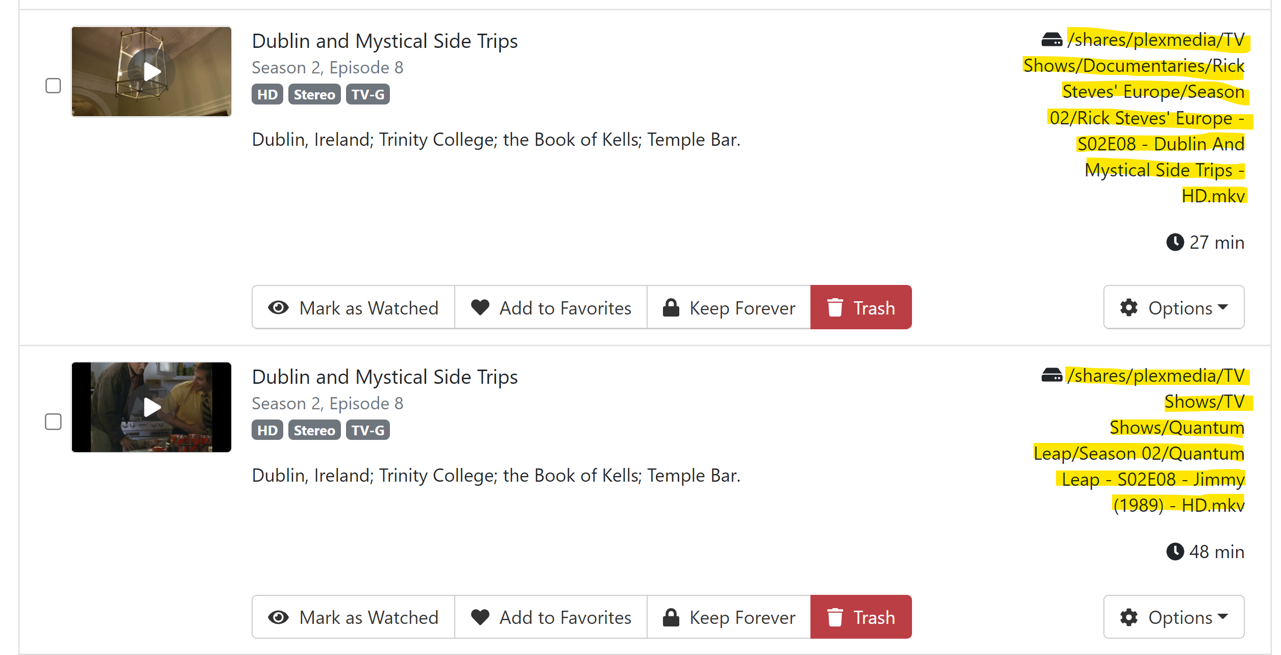 As you can see from the screenshot it is grouping these two different shows together as one show. I have also highlighted the paths and file names showing that they are in two completely different directories (although show a common directory higher up in the path). I am using the Plex naming convention for the actual file names (this server is also a Plex server). I read the docs on file naming conventions: