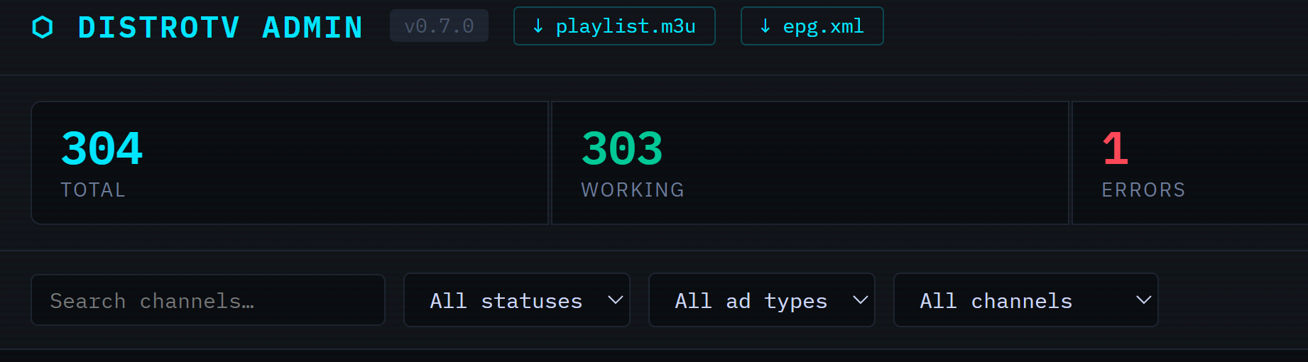- Admin UI to monitor channel health and toggle channels in/out of your playlist