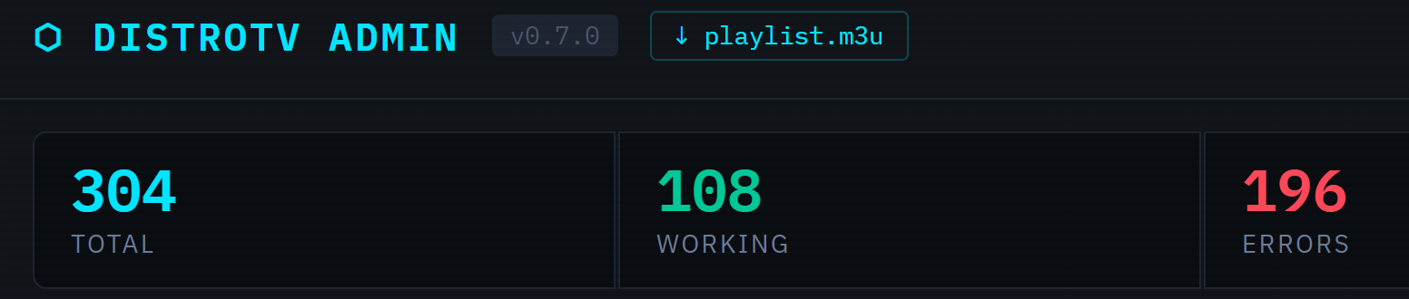 - Serves a live M3U playlist + XMLTV EPG from DistroTV's full channel lineup