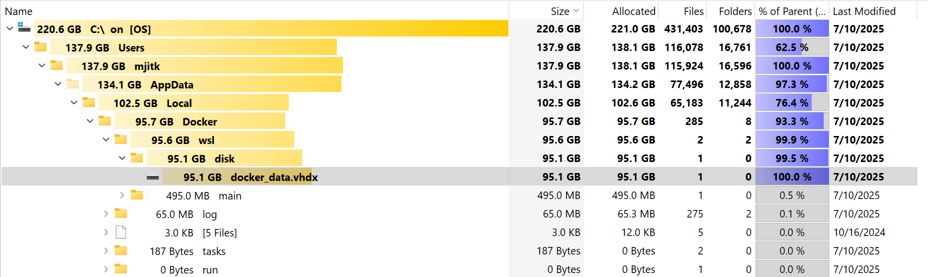 I used the Tree Size application to check the drive space and it's Docker that is eating most of the disk space: