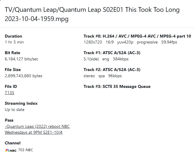Input #0, mpegts, from '/shares/dvr/TV/Quantum Leap/Quantum Leap S02E01 This Took Too Long 2023-10-04-1959.mpg':