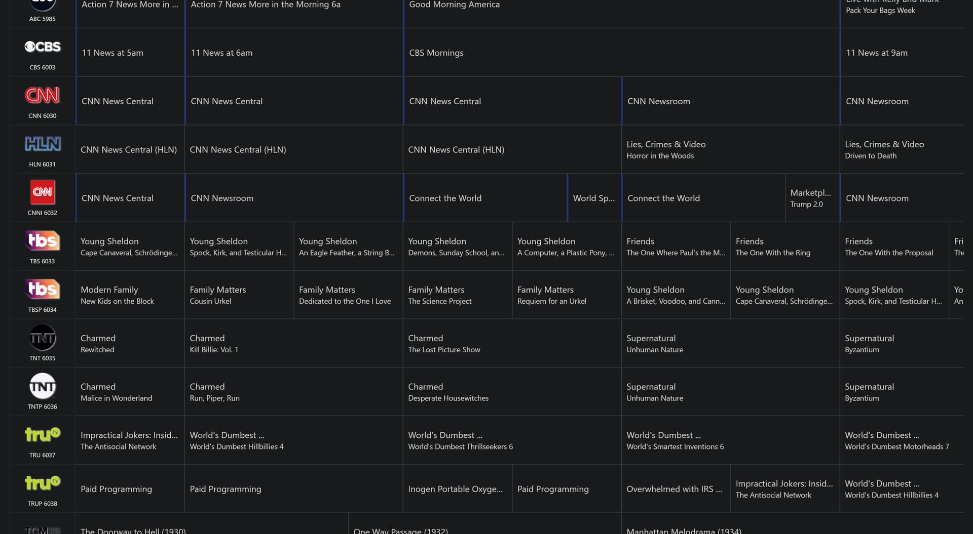 TBS, TNT and TruTV are shown multiple times, as those are the East and West coast feeds which I specifically added to the collection.