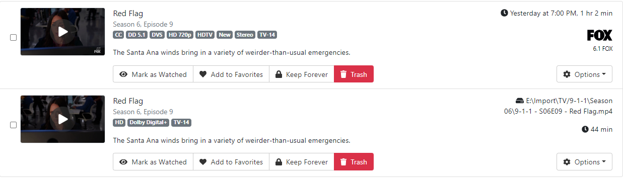 I want to record episodes as they are aired, then replace those with versions from other sources, like PlayOn Cloud, etc. Those episodes are clean, no commercials, and are, in some cases, better quality. It would be nice if the DVR could combine those two version into one episode, so once it is watched, I don't have another unwatched episode that is exactly the same. Currently, these episodes show up as two items with the same info:
